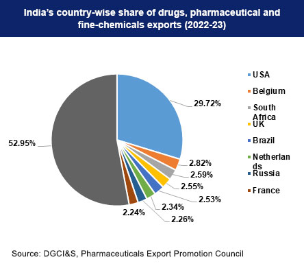 The US, Belgium, and South Africa were among the largest importers from India at a share of 29.72%, 2.82%, and 2.59%, respectively during 2022-23. India’s exports of pharma products to these countries in FY23 were USA with US$ 7.54 billion, Belgium with US$ 714.92 million, South Africa with US$ 657.0 million, the UK with US$ 647.68 million, and Brazil with US$ 642.67 million. India’s pharma exports to the USA in value grew at a CAGR of 6.18% over the last year. Additionally, for Belgium and South Africa, it grew at a CAGR of 59.2%, and 7.23%, respectively over the same period.